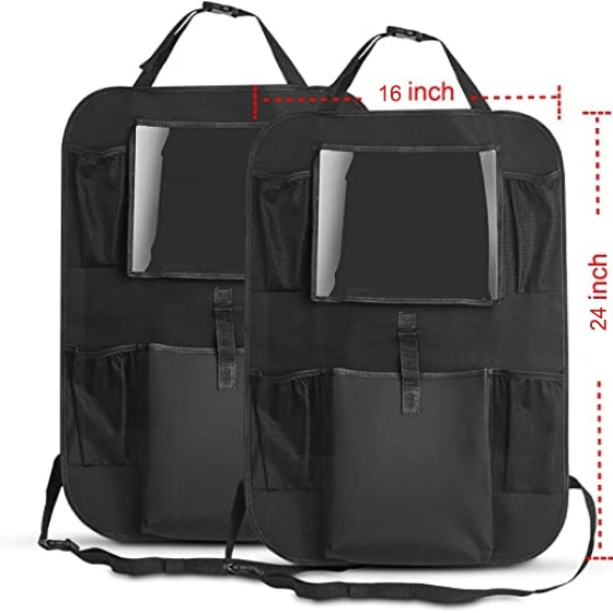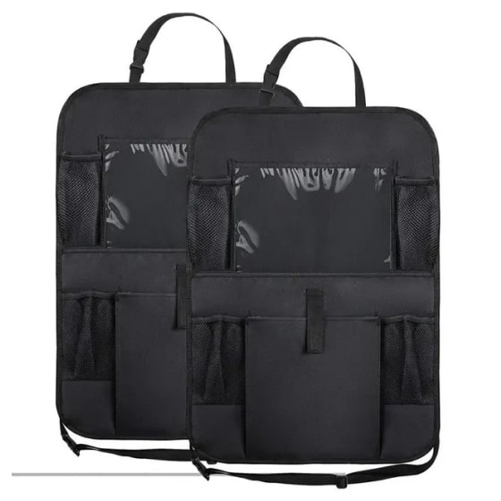 I was getting tired of having so much STUFF in my vehicle - no matter how often I try to clear it out I always need different things when I travel. Found these and was happy to be able to tidy my vehicle! These seat back organizers are perfect. I am able to neatly put books, make up, pens, tissues, snacks - just about everything that was littering the floor is now neatly stored. This also has a nice size clear compartment that would be ideal if you wanted an iPad or screen for kids to watch it to store their travel necessities. Easy to fit over the back of the seats too and so I’m sure easy to move from vehicle to vehicle if needed. Great value.
