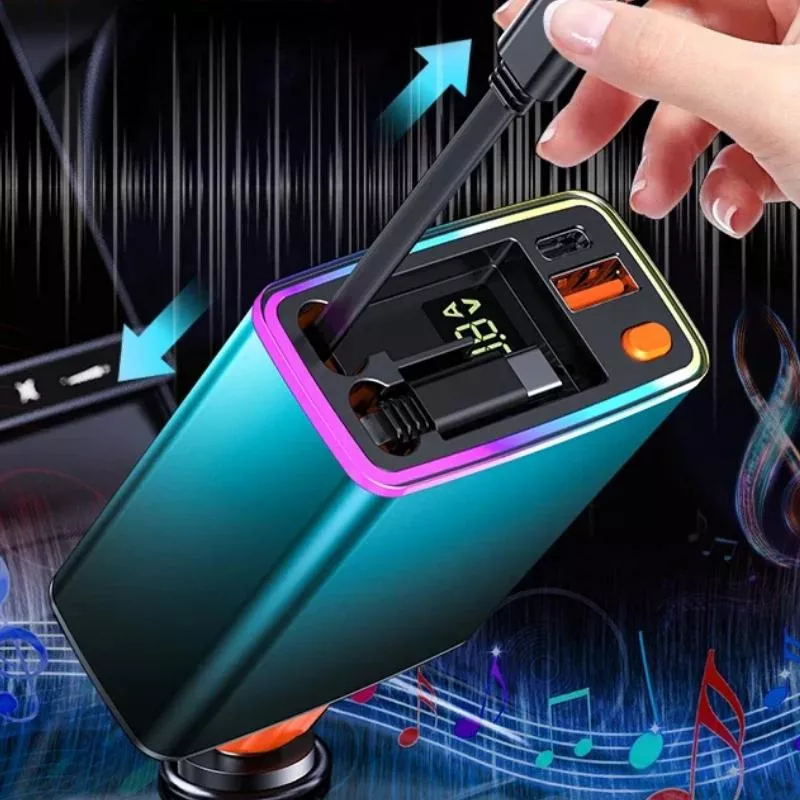 Fast Charging Car Charger with Retractable Cable & Ambient Light – USB/Type-C