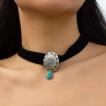 Gothic Black Velvet Choker Necklace with Stone Flower Pendant