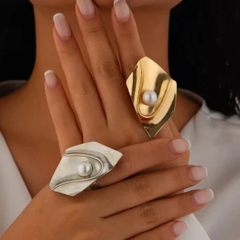 Exaggerated Geometric Adjustable Gold Ring with Simulated Pearl